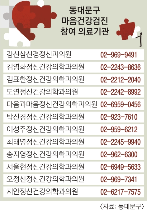 유덕열 동대문구청장은 “약 처방 없이 검진이나 상담을 받는 경우 정신과 진료기록으로 남지 않으니 부담 없이 마음건강 검진을 받길 권한다”고 밝혔다.