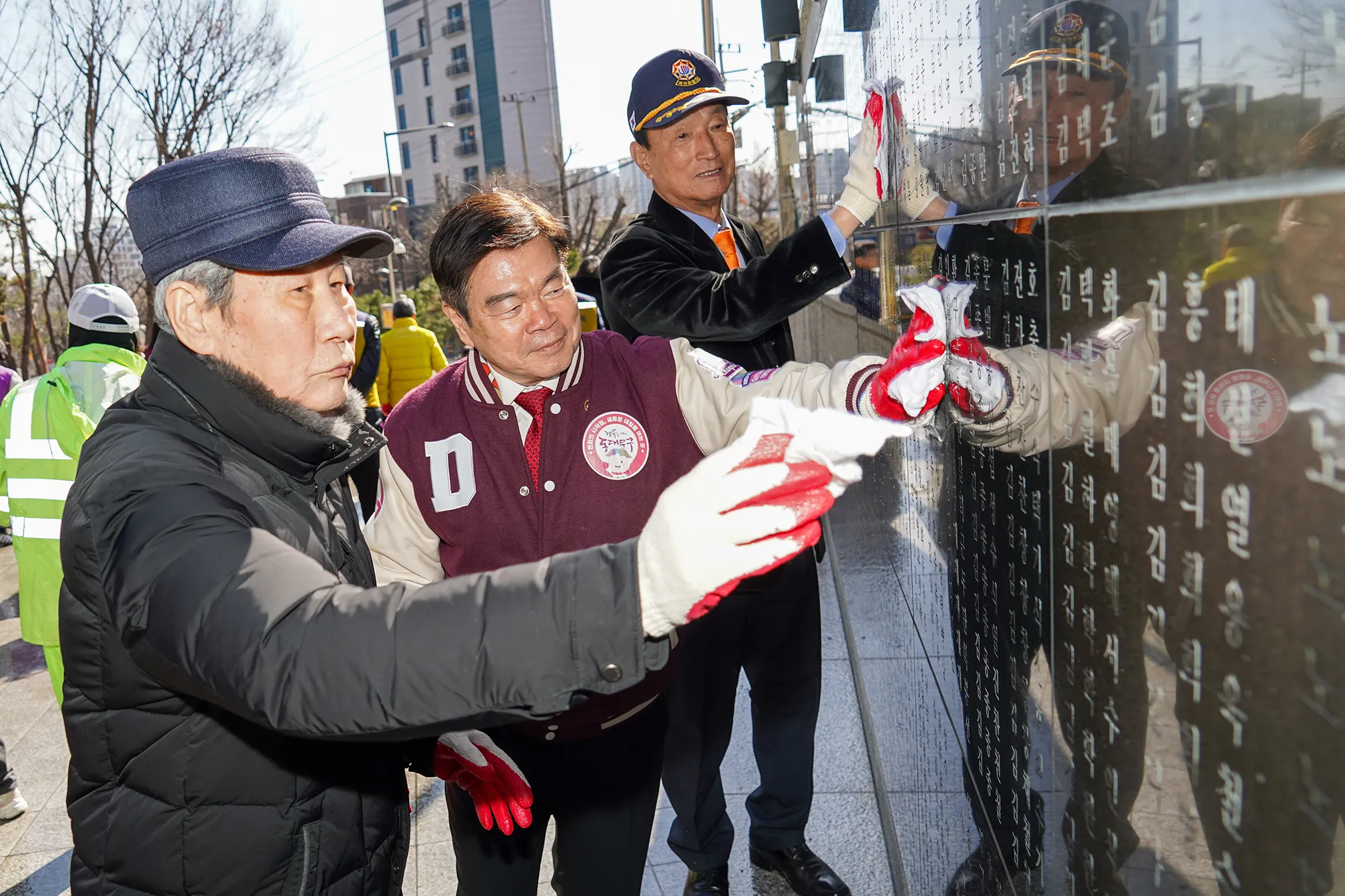 3·1절을 사흘 앞두고 진행한 이날 대청소는 살수차를 이용해 참전유공자비에 세찬 물을 뿌리며 시작했다. 거센 물줄기를 맞은 명비와 조형물에서는 겨우내 묵은때가 씻겨져 내려갔고 참석자들은 수건으로 명비에 묻은 먼지와 물기를 깨끗하게 닦아 냈다. 이어 대청소는 순국선열과 호국영령에 대한 묵념과 헌화로 마무리됐다.