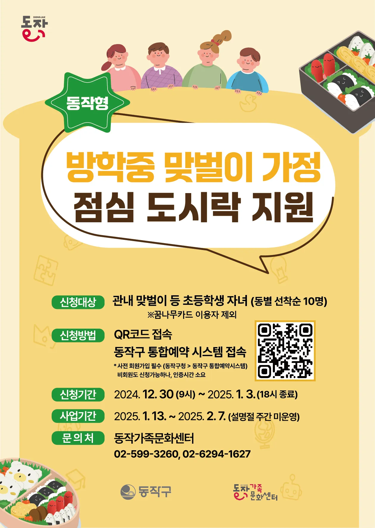 초등학생을 둔 지역 ▲맞벌이가정 ▲한부모가정 ▲구직활동 중인 가구에서는 누구나 동작구청 홈페이지 통합예약 시스템을 통해 신청할 수 있다. 대상자로 선정될 경우 관할 동주민센터에 방문해 도시락을 수령하거나 주민센터 내 별도로 마련된 공간에서 식사할 수 있다.