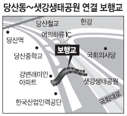 영등포구는 당산동 주거지와 샛강생태공원을 연결하는 보행교에 대한 설계 용역에 착수했다고 17일 밝혔다. 사업비 75억원을 들여 너비 5.3m, 길이 133m 규모로 조성되는 보행교는 2015년 완공 목표다. 지금까지 당산동 주민들이 샛강생태공원 등을 이용하려면 차량으로 이동하거나 도로변 인도로 돌아가는 불편을 겪어야 했다.