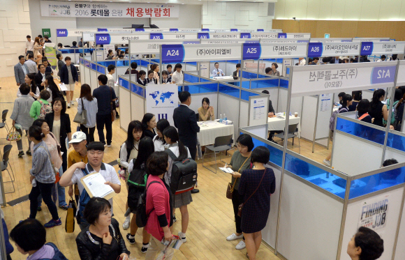 27일 서울 은평구청에서 열린 ‘2016 롯데몰 은평 채용박람회’에서 주민들이 구직상담을 받기 위해 부스를 돌아보고 있다. 이날 행사는 올 연말 구파발역에 들어서는 롯데몰에서 지역주민들을 우선 채용하기 위해 은평구와 ㈜롯데자산개발이 업무협약을 맺고 마련했다.