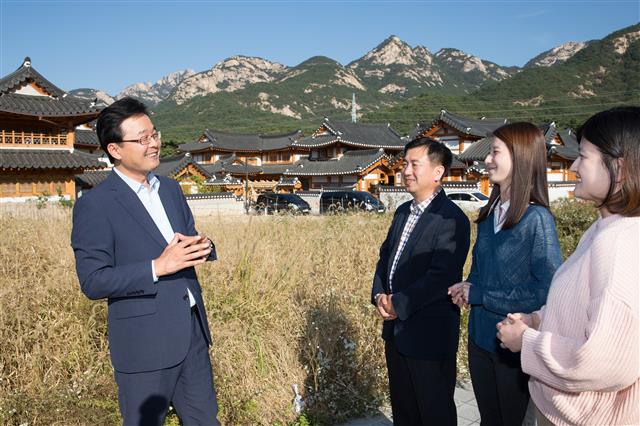 김우영(왼쪽) 서울 은평구청장이 국립공원 북한산 자락에 있는 은평 한옥마을에서 주민들과 함께 한문화특구 발전 방향에 대해 이야기하고 있다.