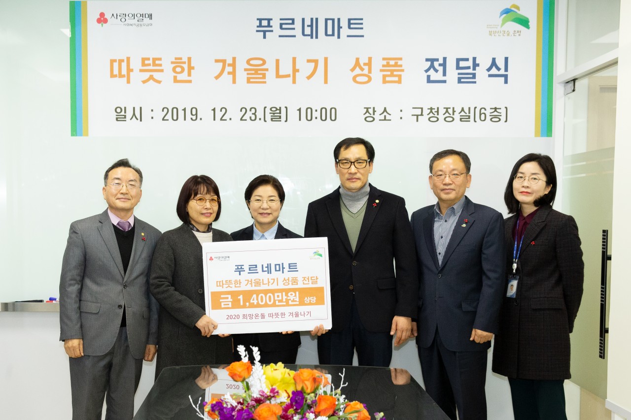 지난 23일 서울 은평구청 구청장실에서 푸르네마트 관계자들과 김미경(왼쪽 세 번째) 은평구청장이 따뜻한 겨울나기 성품 전달식을 진행하며 기념사진을 찍고 있다.