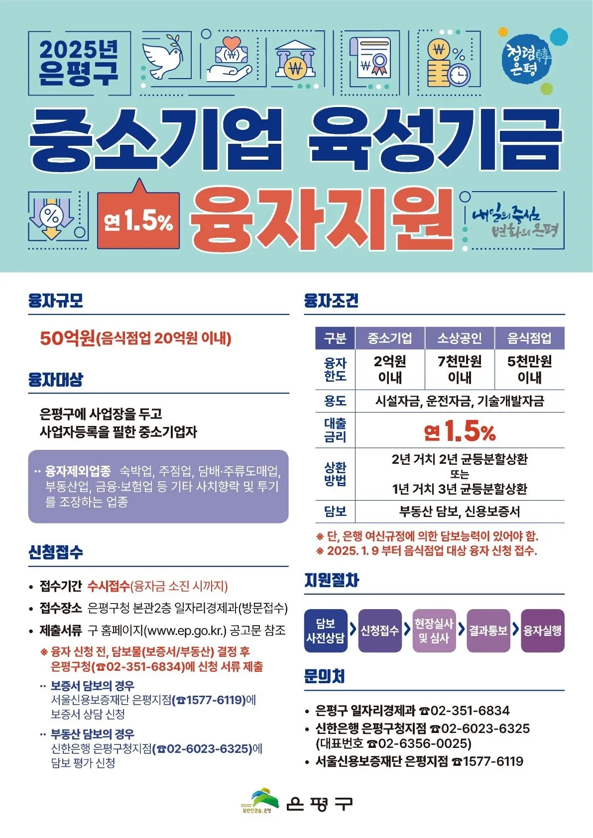 융자 신청을 위해선 부동산 담보와 신용보증서 등의 담보 능력이 있어야 한다. 신청을 원하는 업체는 서울신용보증재단 은평지점 또는 신한은행 은평구청지점을 통해 담보물 상담을 거쳐야 한다. 이후 구 누리집 공고에 게시된 신청서를 작성하고 기타 증빙서류와 함께 구청 일자리경제과로 방문 및 신청하면 된다.