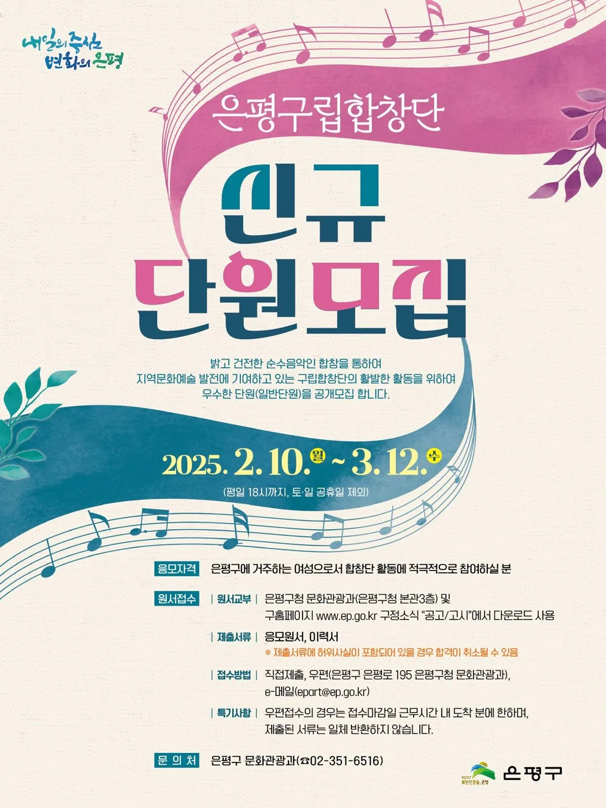 김미경 은평구청장은 “구립합창단은 구민에게 큰 기쁨을 주는 우리 구의 자랑”이라며 “이번 신규 단원 모집에 많은 관심을 부탁드린다”고 말했다.