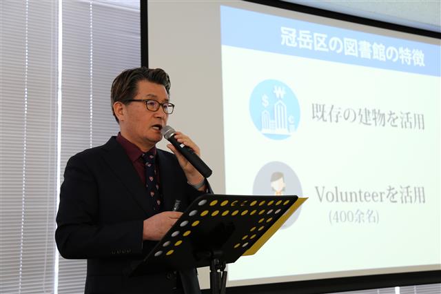관악구의 도서관 사업현황도 소개했다. 2010년 국회도서관장 재직 당시 도서관운동을 퍼뜨리기 위해 관악구청장에 출마한 유 구청장은 폐컨테이너를 개조한 공원도서관, 미니버스 3대가 지하철역·집 근처로 책을 배달해 주는 ‘지식도시락 배달’을 성공시켰다. 그는 “지식도시락 배달로 지난 1년간 배달된 책만 40만권, 쌓으면 후지산의 약 2배 높이다”고 했다.