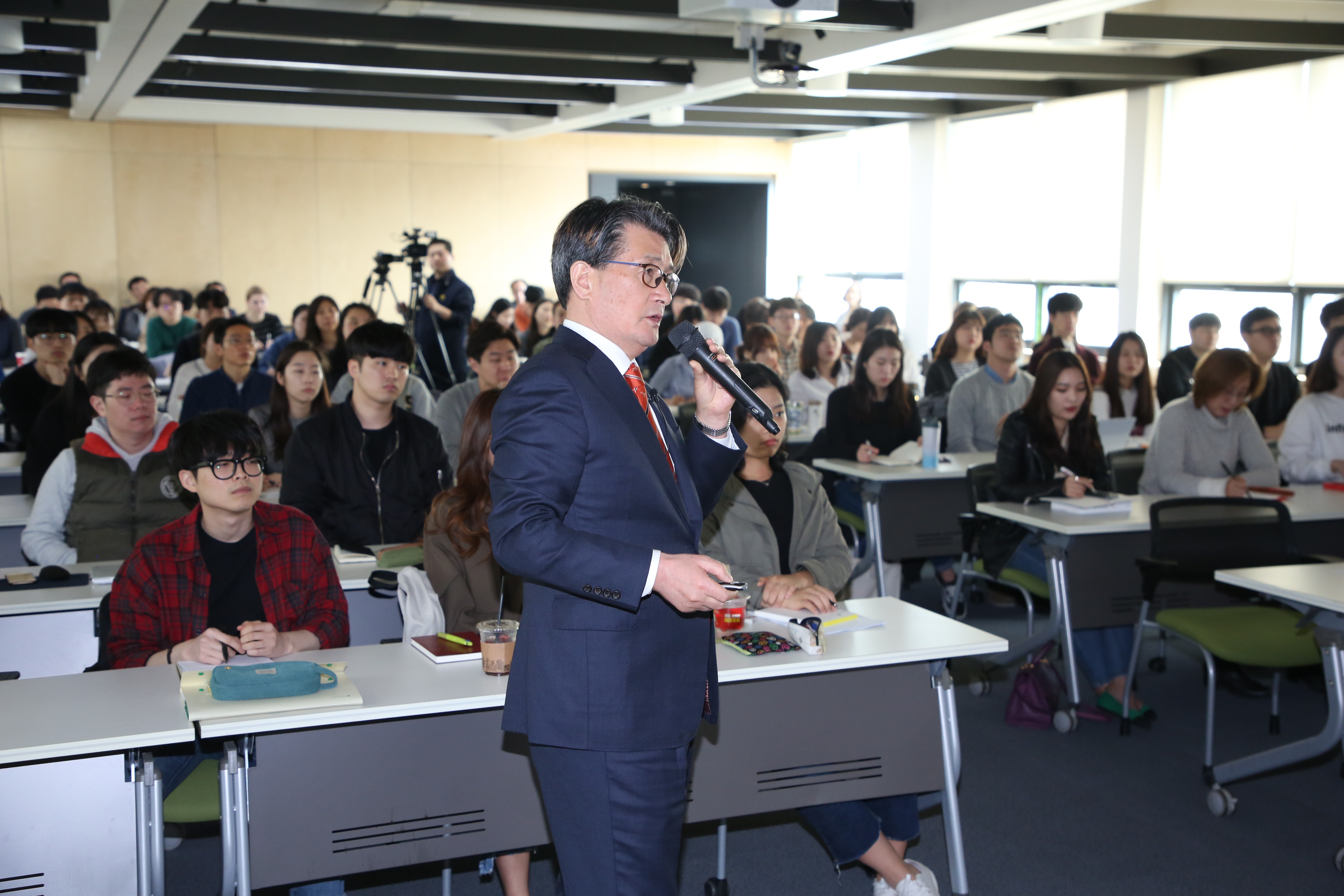 유종필 관악구청장이 지난 14일 서울 관악구 서울대 환경대학원에서 열린 특별 강연에서‘파괴할 수 없는 지식의 탑, 세계의 도서관’이라는 주제로 이야기하고 있다.