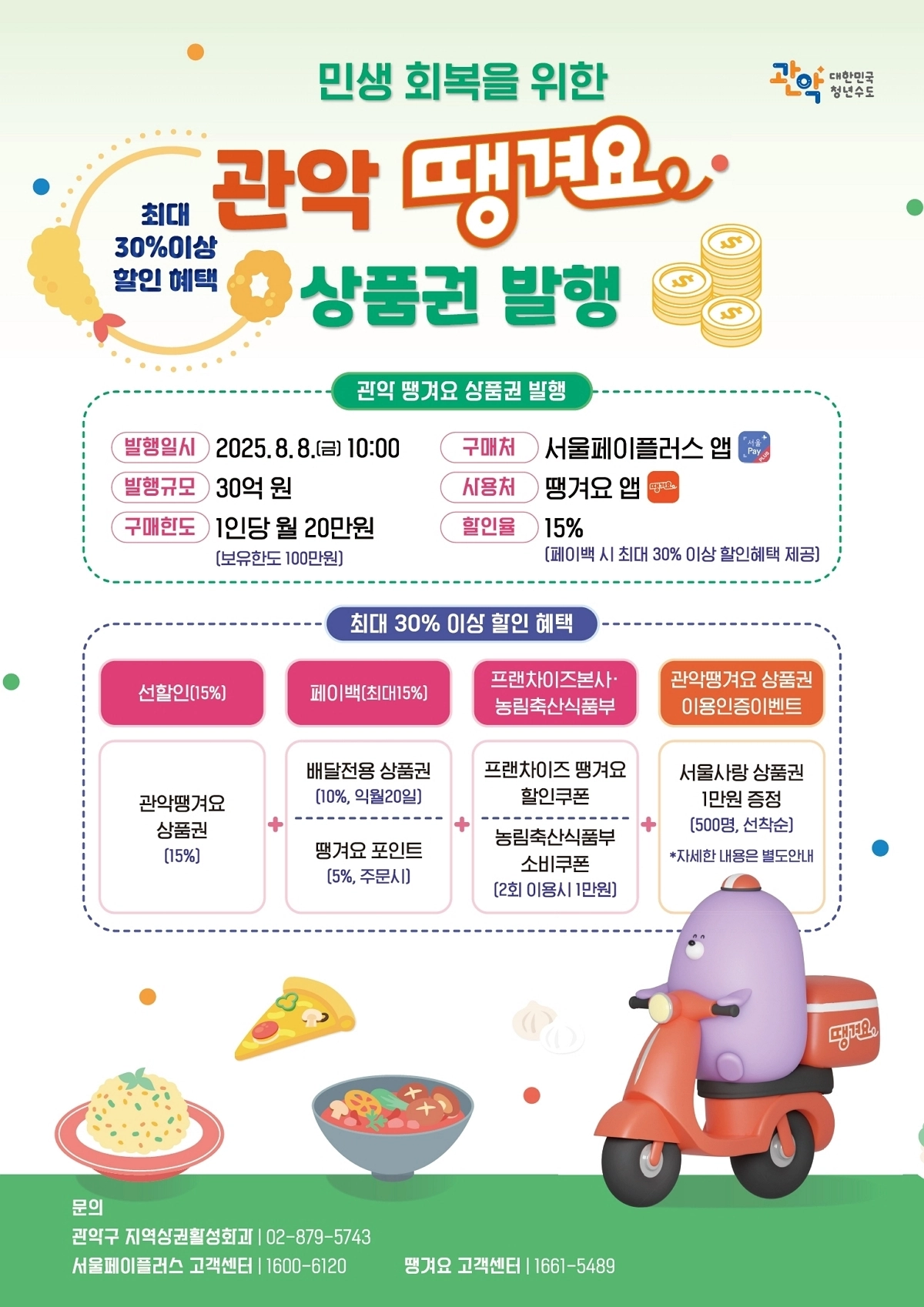 서울 관악구가 오는 8일 공공배달 애플리케이션(앱) ‘땡겨요’에서 사용할 수 있는 ‘관악땡겨요상품권’을 30억원 규모로 추가 발행(포스터)한다고 5일 밝혔다.