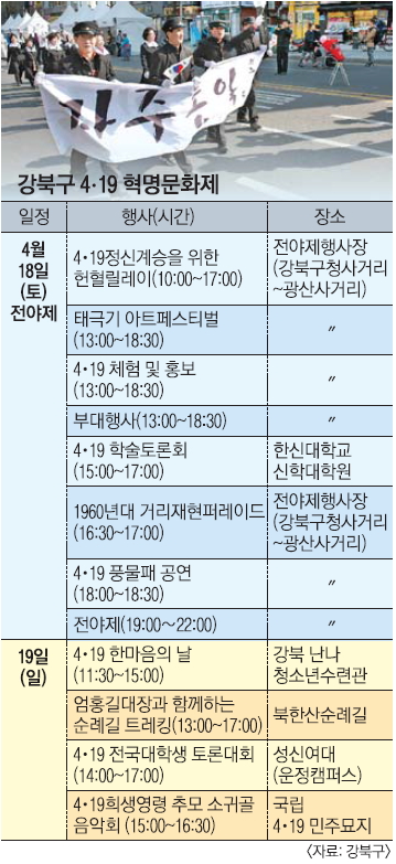 박 구청장은 “국민문화제를 통해 4·19혁명을 잊고 있었던 기성세대와 사건 자체가 생소한 젊은 세대에 그 역사적 가치와 의미가 충분히 전달되기를 바란다”며 “1960년 조국의 민주화를 위해 타올랐던 뜨거운 열정과 함성을 직접 체험하고 느낄 수 있는 문화제에 많은 참여를 부탁한다”고 말했다.