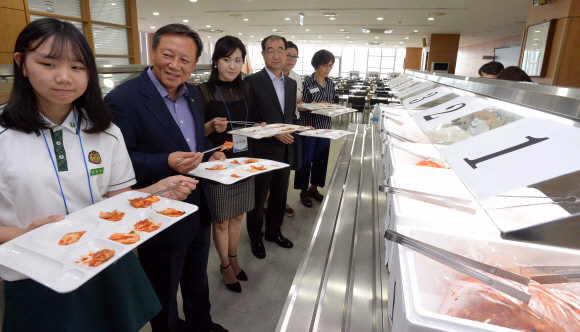 14일 차성수(왼쪽 두 번째) 금천구청장이 관내 초·중·고교에 공급할 김치 업체를 선정하기 위해 심사평가단과 함께 시식할 김치를 식판에 담아 들고 있다.