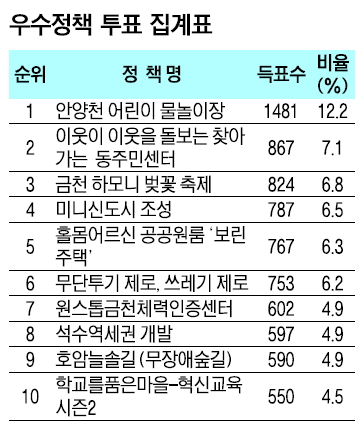 1위에 선정된 안양천 어린이 물놀이장은 지난해 7월 문을 열어 1일 3500명, 연간 6만 5000여명의 주민이 찾는 금천구의 여름 피서지다. 특히 지역 어린이의 사랑이 각별한 곳이다. 또 ‘찾아가는 동주민센터’는 기존 민원·행정 기능 중심의 주민센터를 공무원이 직접 주민을 찾아가는 복지와 주민 주도의 마을공동체로 혁신해 높은 평가를 받은 것으로 나타났다. 이번 조사에서 주민들은 직접 체감할 수 있는 사업을 우수정책으로 꼽았다.