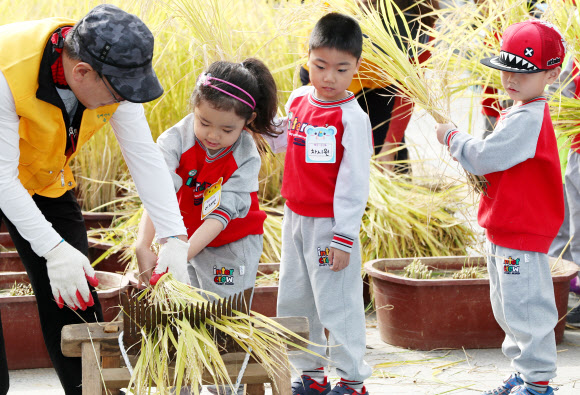 탈탈 털어서 냠냠 밥먹자  어린이들이 13일 서울 금천구청에서 어른들의 도움을 받아 벼를 전통 방식으로 탈곡하고 있다. 이날 탈곡한 벼는 구 청사 안 상자텃밭에서 길렀다.<br>연합뉴스