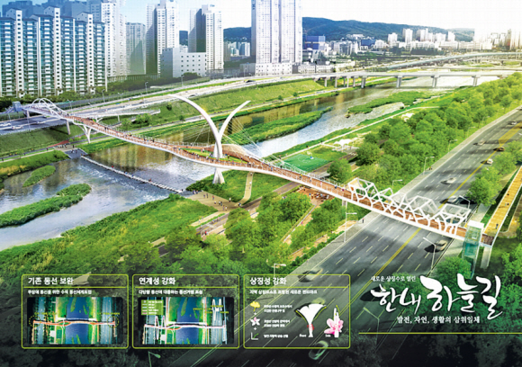 구는 지난달 실시한 설계 공모 작품 심사를 통해 4개의 당선작과 입상작을 선정했다. 당선작 ‘한내 하늘길’은 구조적으로 안전하면서도 주변 경관과 조화를 이루는 창의적인 디자인으로 심사위원들에게 높은 점수를 받았다. 다리 위에 쉼터를 마련하고 교통 약자를 위한 경사로와 엘리베이터를 설치할 예정이다. 규모는 너비 4.5m, 길이 200m다. 올해 말 착공해 2020년 상반기 완공한다.