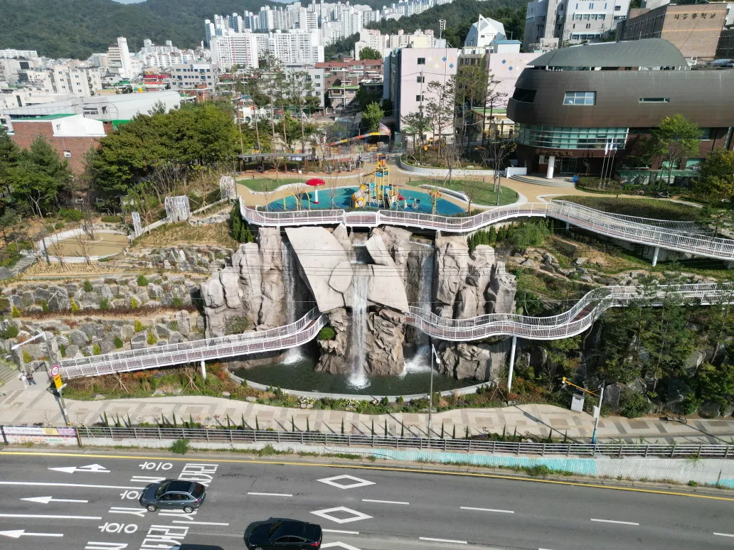 2008년 조성된 폭포는 공원의 상징물 역할을 해 왔다. 그러나 시설 노후로 2020년 재조성이 결정됐다. 공원 상부와 하부를 연결하는 보행 데크에서 주민들은 부담 없이 산책하며 폭포수를 가까이서 느끼고 체험할 수 있다. 폭포의 3개 물줄기는 금천구의 가산동·독산동·시흥동 3개동을 상징한다.