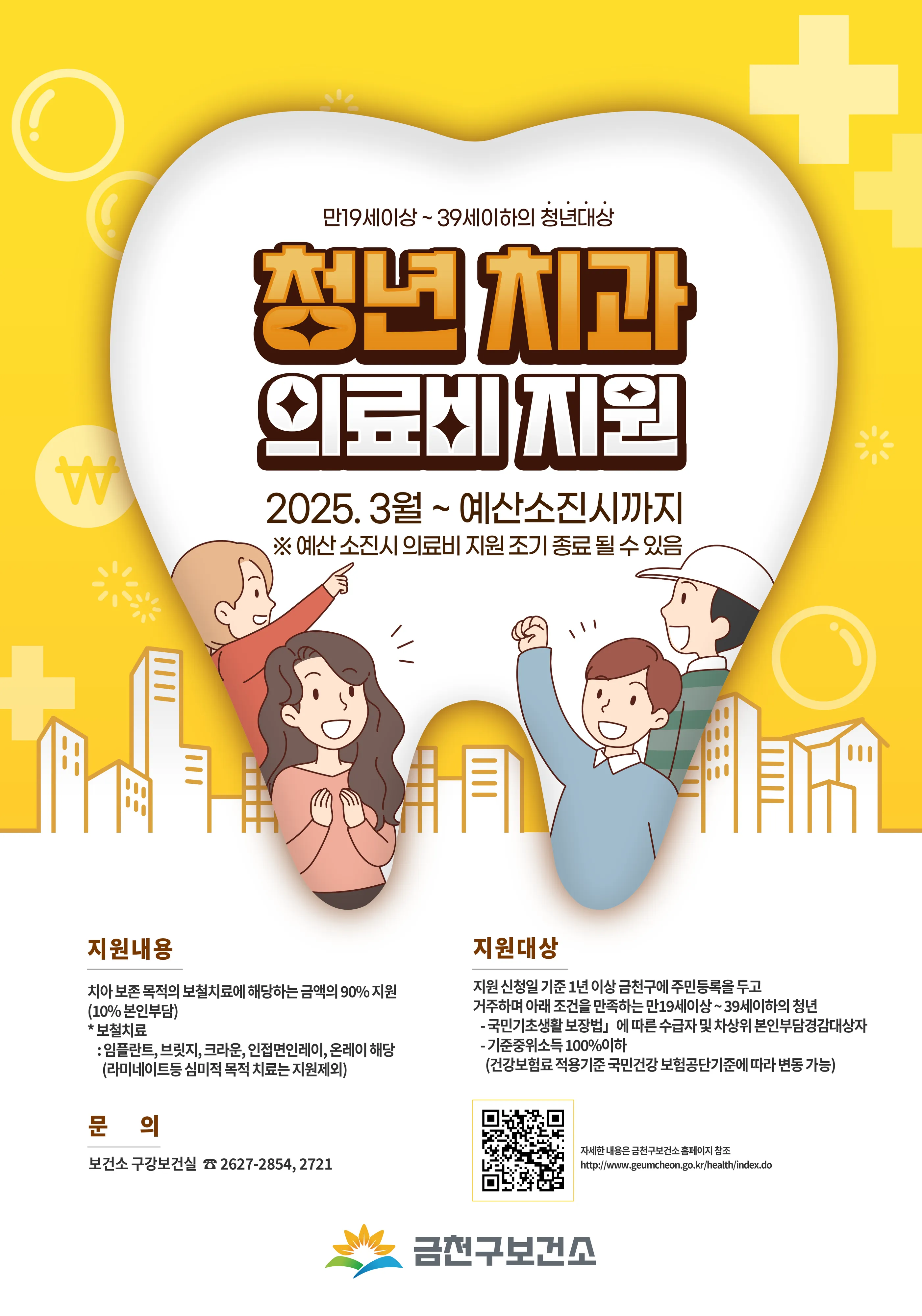 유성훈 금천구청장은 “청년에게 치과 치료비를 지원하는 것은 건강한 구강 관리 문화를 확산하는 중요한 첫걸음”이라며 “앞으로도 청년들이 경제적 부담 없이 적절한 치료를 받을 수 있도록 지원을 아끼지 않겠다”고 말했다.