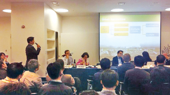 9일 이해식(왼쪽) 강동구청장이 동대문디자인플라자(DDP) 2층 살림터 북세미나실에서 열린 분과회의 발표자로 나서 강동구 친환경 도시농업 사례를 설명하고 있다.