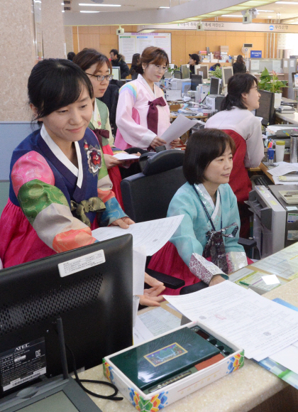 설 연휴를 사흘 앞둔 25일 서울 강동구 민원실 직원들이 한복 차림으로 민원인들을 맞고 있다. 강동구 민원부서 직원들은 명절 분위기를 내기 위해 25일과 26일 한복을 입고 근무하기로 했다.