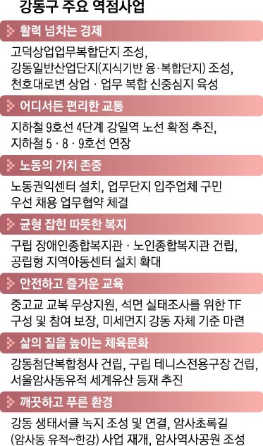 최근 강동구는 ‘강남 4구’라는 명칭을 얻고 여러 개발 이슈로 일부에선 ‘뜨는 지역’으로 비치기도 한다. 하지만 아직도 지역·계층 간 불균형이 엄존한다는 게 이 구청장의 생각이다. 이 때문에 노동권익센터 설립, 구립 장애인종합복지관 설립, 공립형 지역아동센터 설치 확대 등으로 구민들의 삶을 살뜰히 살펴 ‘더불어 행복한 강동’을 이루고자 한다. 암사초록길 사업 재개, 암사역사공원 건립, 강동 생태서클 녹지 조성 등으로 생태·문화도시로의 위상도 높일 계획이다.