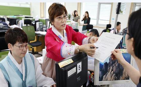 민원 응대 부서인 민원여권과·교통행정과·부동산정보과 직원들이 색색의 한복을 차려입고 주민들을 맞이하며 즐거운 설 명절 분위기를 조성하고, 한복의 멋과 아름다움을 알린다.