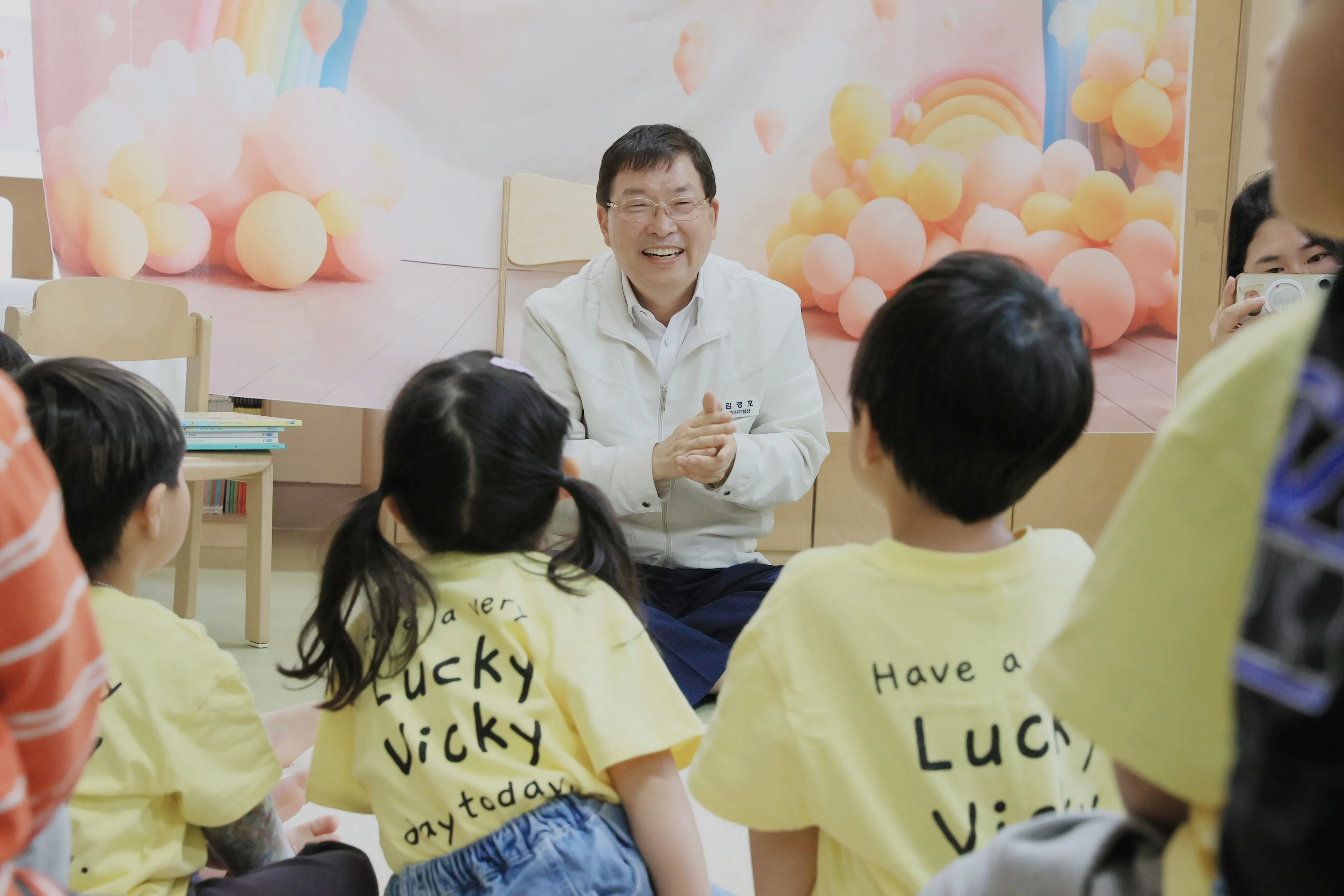 김 구청장은 단순히 책을 읽어 주는 데서 그치지 않고 책 속 이야기를 바탕으로 아이들과 자연스럽게 대화를 나눴다. ‘우주’, ‘할아버지’, ‘고양이’ 등 아이들이 흥미를 느낄 수 있는 주제를 중심으로 이야기했다. 질문도 받았다. 아이들은 저마다 질문하겠다며 손을 들었다. 프로그램이 끝나자 아이들은 감사의 뜻으로 ‘다섯 글자 예쁜 말’이라는 노래를 불렀다.