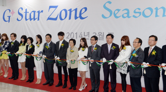 31일 서울 강남구 청담동 지하철 분당선 압구정로데오역에 만든 저소득층 청소년 지원을 위한 상설 기부 창구인 지플러스 스타존 시즌3 개막식에 참석한 신연희(오른쪽에서 일곱 번째) 강남구청장과 걸그룹 카라의 한승연, 레인보우 재경 등 참석자들이 테이프 커팅을 하고 있다.