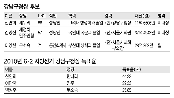 서울에서 유일하게 여성끼리 맞붙었다. 여권층이 가장 두터운 강남에서 이번 선거가 주목을 끄는 까닭이다. 민선 5기에 이어 재선을 노리는 새누리당 신연희(66) 후보와 교육 전문가이자 시의회 의원을 지낸 새정치민주연합 김명신(57) 후보가 주인공이다.