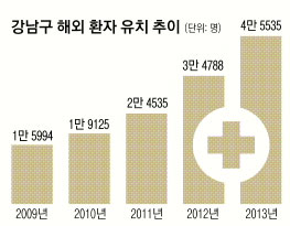 또 해외설명회와 국내외 의료관광 국제 콘퍼런스 참가, 의료관광 협력기관 선정 및 지원, 의료관광 통역지원단 운영과 코디네이터 통역단가 표준안을 마련하는 등 정책적 지원도 많았다. 특히 지난해 6월에는 압구정동 현대백화점 옆에 강남메디컬투어센터를 만들어 강남을 찾는 외국인 환자들이 더 손쉽고 싼값에 의료 서비스를 이용할 수 있도록 각종 서비스를 제공하고 있다.