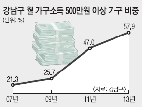 두꺼운 중산층, 높은 교육비로 유명한 서울 강남구가 변하고 있다. 지난해 처음으로 월 500만원 이상 소득 가구가 절반을 넘었고, 월 200만원 미만 소득 가구 수는 2년 만에 2배 이상 늘어나는 등 양극화가 심해져 교육 1번지의 메리트에 대한 주민들의 생각이 달라지고 있다.