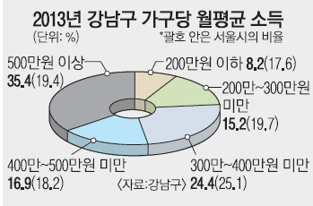 15일 강남구가 펴낸 ‘2013 강남의 사회지표’ 보고서에 따르면 월평균 소득이 500만원을 넘는 가구는 전체의 35.4%에 이른다. 2012년 25.3%에서 10.1% 포인트 늘었다. 서울시 전체에서 소득 500만원 이상 가구는 19.4%에 불과하다. 이 비율도 2012년(20.1%)보다 다소 감소한 것임을 감안하면 강남구의 고소득가구 증가세는 ‘부의 대물림’이 늘고 있다는 방증이다.
