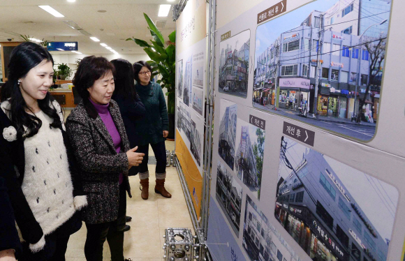 19일 서울 강남구 삼성동 강남구청 1층 로비에서 개막한 간판 개선 우수 사례 전시회를 시민들이 관람하고 있다. 이 전시회는 강남구가 간판 제작·설치 업체의 재능 기부로 보기 좋게 바뀐 간판을 알리기 위해 기획했으며 오는 23일까지 계속된다.