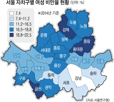 24일 서울연구원의 ‘서울시민의 비만 추이와 결정요인’ 보고서에 따르면 서울 시민 비만율은 남성 31.7%, 여성 16.2%로 2배(2014년 기준)가량 차이 났다. 또, 여성 비만율을 25개 자치구별로 나눠보면 강남구는 7.4%로 가장 낮았고 금천구와 중랑구는 22.5%로 가장 높았다. 특히 강남 3구 여성 비만율은 2011년 이래 줄곧 서울 내 최저 수준이었으며 다른 지역과 차이도 매년 벌어졌다. 연구를 주도한 손창우 부연구위원은 “강남권역에는 피트니스센터 등 운동시설이 다른 권역보다 많고 패스트푸드 등 살찌는 음식도 비교적 덜 접하게 되는 환경”이라고 설명했다. 실제 강남권 여성은 채소·과일을 다른 지역 여성보다 월등히 많이 먹는 등 일반적으로 건강한 식습관을 가진 것으로 조사됐다.