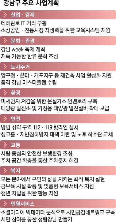 -강남은 1970년대 초부터 토지 구획 틀 아래 개발됐다. 현재 강남 아파트는 건립된 지 30~40년이 돼 노후화됐다. 구민 주거 환경 개선을 위해 차근차근 순서대로 재건축해야 한다.