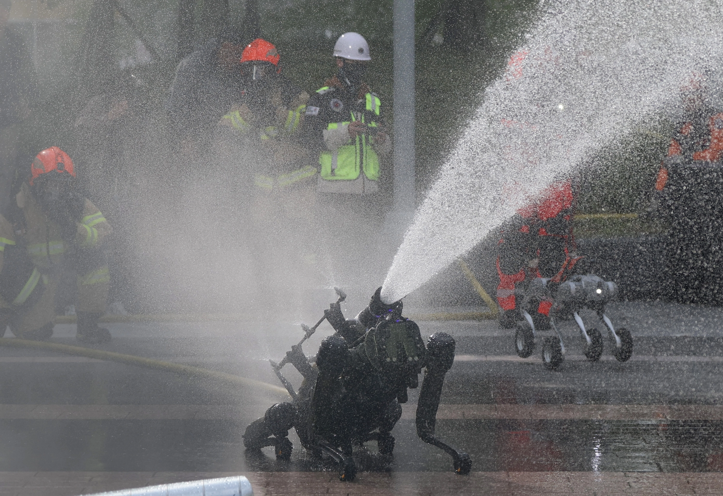 20일 서울 강남구 코엑스에서 열린 ‘2025 강남구 안전한국훈련 긴급구조 종합훈련’에서 로봇 개가 화재 진압을 돕는 모습. 지하 주차장 전기차 화재 발생 상황을 가정해 열린 이번 훈련에는 강남소방서, 강남경찰서 등이 참여했다. 연합뉴스