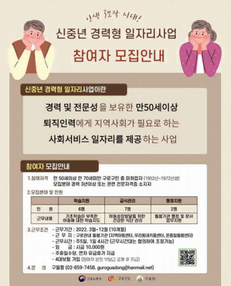 구 관계자는 “인력 부족으로 어려움을 겪는 지역 돌봄 시설에 은퇴한 전문 인력을 배치하고 참여자에게는 재취업의 기회를 제공하는 ‘신중년 사회공헌활동 지원 사업’(포스터)을 운영한다”고 설명했다. 구는 지난해 고용노동부 신중년 경력형 일자리 사업 공모에 선정돼 국비 등 총 1억 9000여만원의 예산을 투입해 이번 사업을 추진한다.