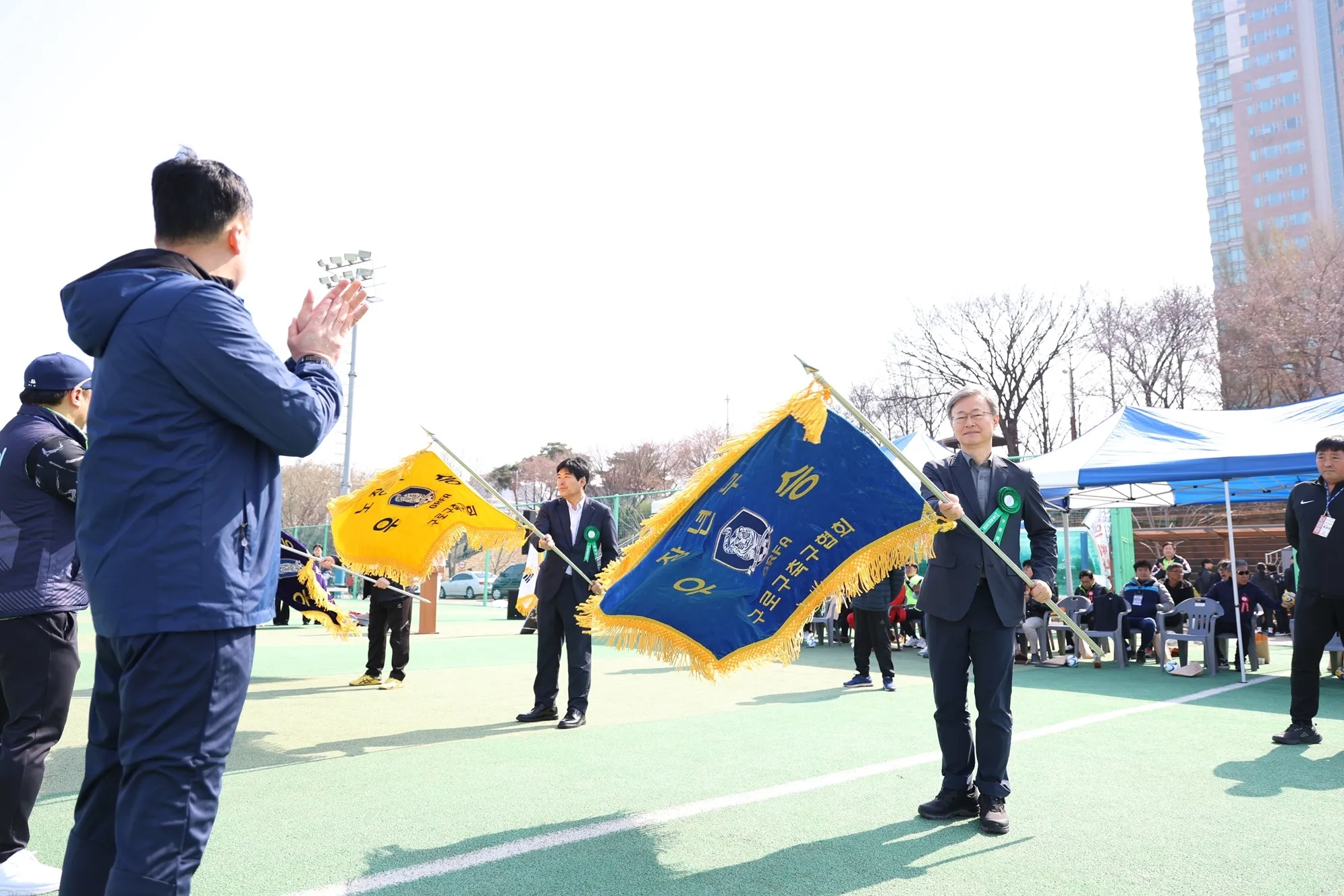 장인홍(오른쪽) 서울 구로구청장이 지난 6일 안양천C구장에서 열린 ‘제42회 구로구협회장기 축구대회’에 참석해 우승 깃발을 흔들고 있다.