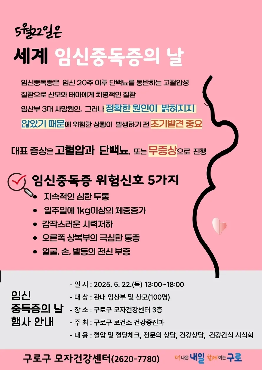 서울 구로구가 22일 모자건강센터에서 임산부 100명을 대상으로 ‘생명을 지키는 엄마의 따뜻한 실천! 임신중독(毒)증의 날’ 행사를 개최한다고 20일 밝혔다.