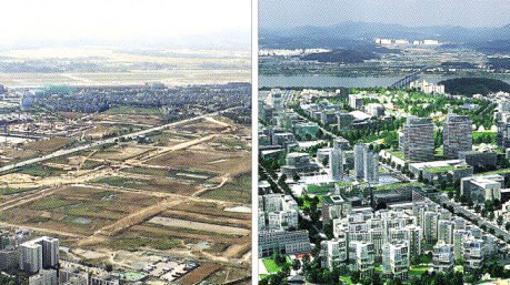 " title="서울 자치구 가운데 두 번째로 인구 60만명 시대를 맞을 강서구는 마곡지구 개발로 구 발전이 더 가속화될 전망이다. 사진은 마곡지구의 개발 전 황량한 모습(왼쪽)과 대도시급으로 발전한 모습을 그린 조감도.