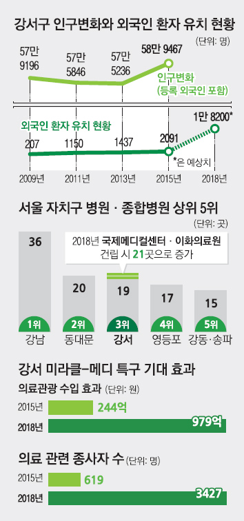2018년 봄. 30대 부부 예카테리나와 세르게이는 러시아 블라디보스토크에서 2시간 40분을 날아 한국 인천공항에 도착했다. 입국장에 들어서자마자 유창한 러시아어로 맞이하는 여성을 만났다. 앞으로 2주 동안 예카테리나와 세르게이에게 병원 진료와 지역 여행을 안내할 의료 코디네이터다. 병원에서 제공한 넓고 편안한 차량에 몸을 싣고 서울 강서구에 있는 한 호텔로 옮겼다. 2~3주 걸리는 불임 시술을 하러 왔기 때문에 숙박비가 부담됐지만, 넓고 깨끗한 호텔 객실료를 40%나 할인받았다. 다음날 호텔 옆 병원을 찾아 건강 상태를 확인하고 불임 시술을 받기 시작했다. 짬짬이 근처 전통시장에 들러 생활상도 구경할 예정이다. 전통시장 쿠폰이 있어 맛있는 먹거리를 20~30% 저렴한 가격에 살 수 있다. 가는 곳마다 러시아어가 적혀 있으니 돌아다니는 데 불편함이 없다. 강서구가 지향하는 ‘강서 미라클-메디 특구’의 미래 모습이다. 지난해 12월 강서로와 공항대로 일대를 대상으로 조성한 미라클-메디 특구는 중소기업청으로부터 의료관광특구로 지정됐다. 2018년까지 척추·관절·여성 병원이 밀집한 이곳 181만여㎡에 국비와 시·구비, 민간자본 등 719억원을 투입해 본격적인 의료관광특구 개발에 나선다.