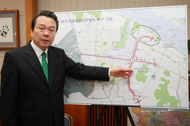 노현송 서울 강서구청장이 17일 구청장실에서 강서 의료문화관광벨트 특구가 표시된 지도를 손으로 가리키고 있다.<br>강서구 제공