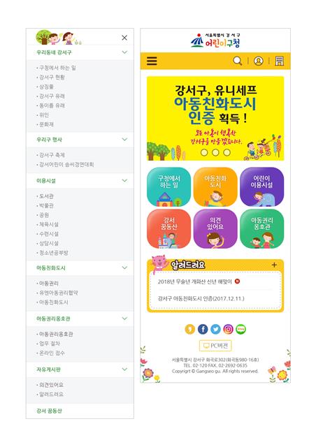 아동친화도시는 아동권리에 대한 이해를 높이기 위해, 의견있어요는 아이들의 다양한 목소리를 듣고 구정에 반영하기 위해 마련됐다. 어린이 이용시설은 도서관 등 아이들이 즐겨 찾는 시설들을 소개한다. 강서꿈동산은 어린이 기자 40명과 구청 공보과 직원들이 만드는 어린이 구정신문 강서꿈동산의 내용을 모두 게재한다. 아이들이 궁금해하는 교육·문화 행사 등 구청 주요 행사를 안내하는 팝업창도 꾸며져 있다. 모바일에서 강서구청 홈페이지 접속 후 ‘어린이구청’을 클릭하면 된다.