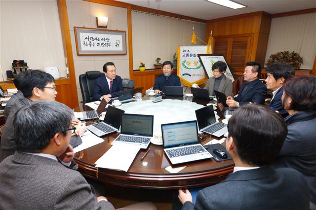 노현송(가운데 넥타이 맨 사람) 강서구청장이 1일 구청 집무실에서 직원들과 회의를 하며 빅데이터 분석을 통한 과학 행정의 중요성에 대해 이야기하고 있다.