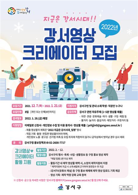 구는 총 8개 팀을 선발해 내년 한 해 동안 ‘지금은 강서시대’를 운영한다. 영상 콘텐츠 제작에 어려움이 없도록 채택된 영상 제작비 일부를 지원하며, 소정의 활동비도 지급한다. 구 관계자는 “주민들의 톡톡 튀는 아이디어로 유익한 구정 소식을 더 친근하고 재밌게 알리려고 한다”며 “구정에 관심 있는 영상 기획·제작 인재의 많은 참여를 바란다”고 말했다.
