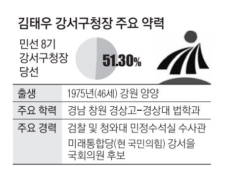 강서구는 더불어민주당 소속인 노현송 현 구청장이 내리 3선을 한 데다 지난 3월 대선 때도 한강에 인접한 11개 ‘한강 벨트’ 자치구 중 유일하게 민주당이 다득표한 지역이다. 그러나 이번 지방선거에서는 12년 만에 보수 정당 후보가 구정을 책임지게 됐다. ‘조국 저격수’로 이름을 날렸던 검찰 수사관 출신 김태우(47) 당선인이 변화를 이끈 주인공이다. 그는 51.30%를 득표해 김승현 민주당 후보(48.69%)를 2.61% 포인트 차이로 누르고 승리했다.