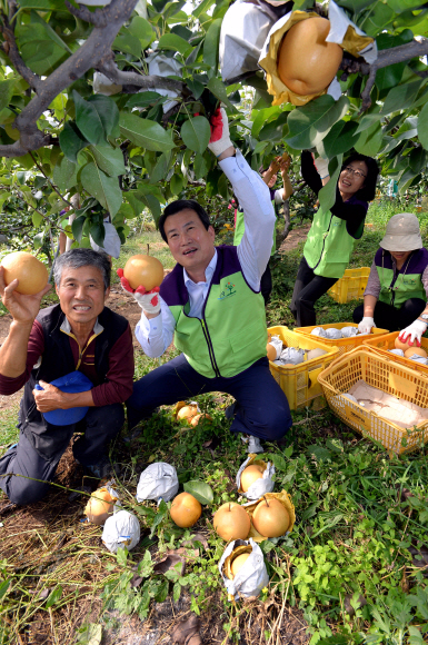 7일 나진구(왼쪽 두 번째) 중랑구청장이 신내동 배밭에서 직원들과 함께 황실배 수확을 돕고 있다. 구한말부터 이 지역에서 재배된 배는 단맛과 과즙이 풍부한 것으로 유명하다.