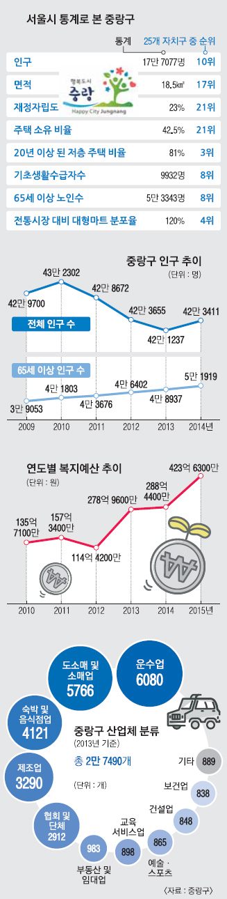 나진구 중랑구청장은 “2018년까지 첨단기업을 유치하고 면목패션특정개발진흥지구를 지정하는 등 경쟁력 있는 산업거점을 육성해 자족도시의 기반을 마련할 것”이라면서 “또 일자리가 늘고 교육의 질이 높아져 눌러 살고 싶은 정주도시가 되도록 최선을 다하겠다”고 말했다.