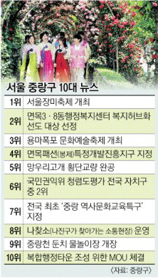 1위는 중랑구의 상징으로 자리 잡은 ‘서울장미축제 개최’(1101표)가 차지했다. 지난해에 이어 2년 연속 1위다. 구가 지난 5월 20~22일 중랑천 장미터널 등에서 연 올해 축제에는 3일간 약 45만명, 축제 기간 전후 3주간 약 77만명이 찾아 ‘잭팟’을 터뜨렸다. 직접 매출액 36억 6910만원, 간접 생산유발 효과 55억 1817만원 등 총 91억 800만원의 생산유발 효과를 내 투입 예산(1억 9000만원) 대비 엄청난 성과가 났다.