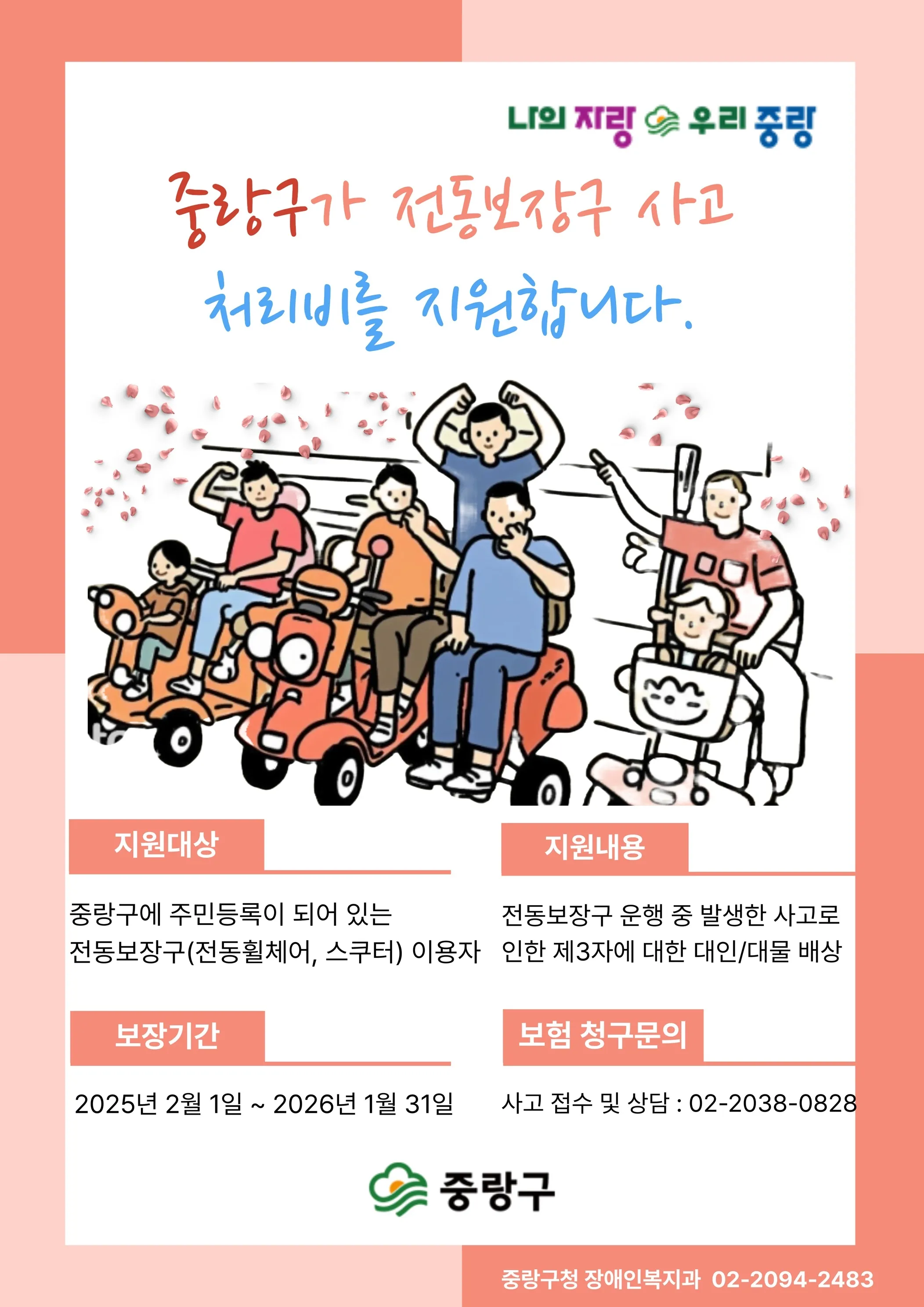 서울 중랑구가 전동휠체어, 전동스쿠터 등 전동보장구 사용 중 발생할 수 있는 사고에 대비한 전동보장구 사용자 배상책임보험 가입을 지원(포스터)한다고 30일 밝혔다.