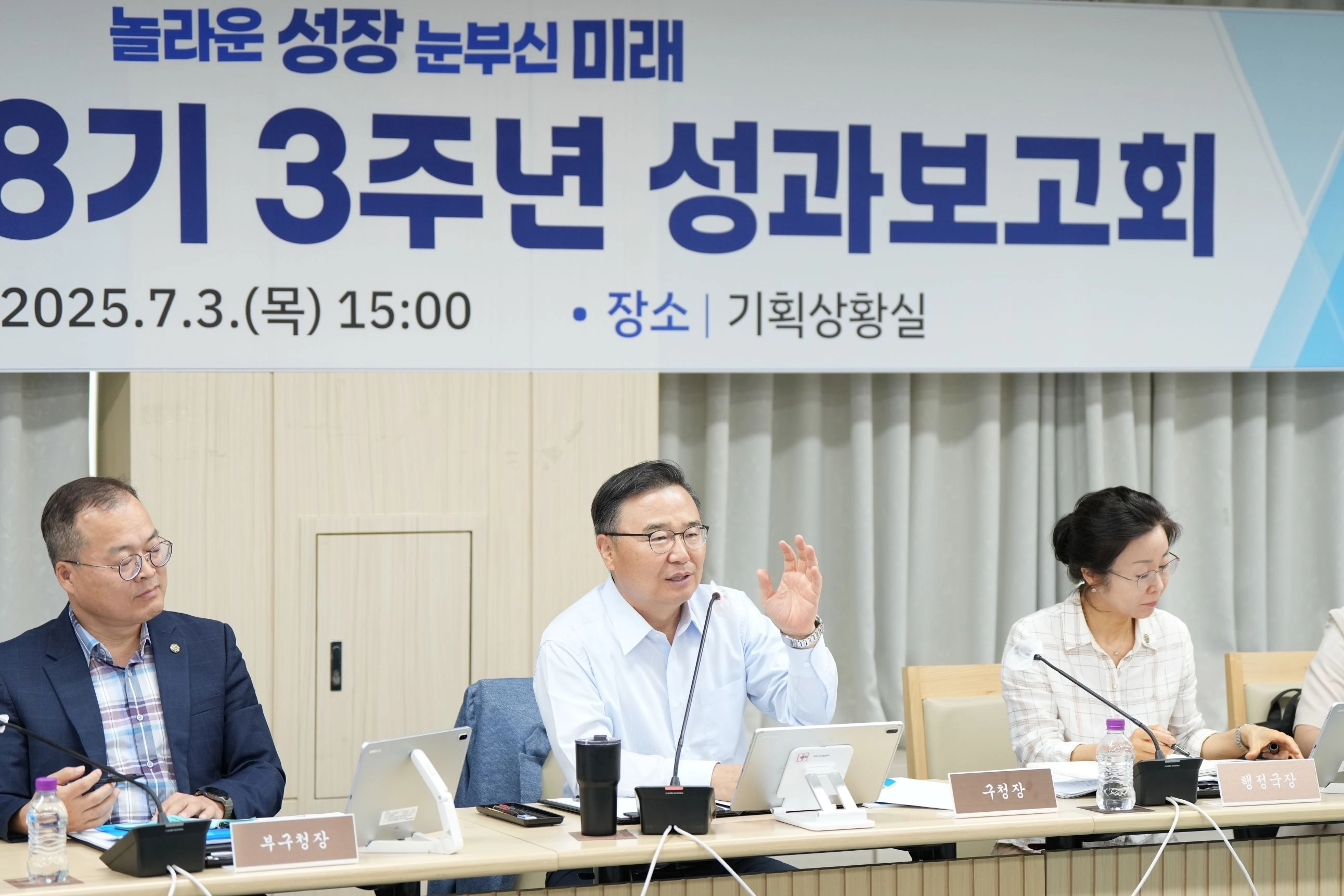서울 중랑구는 지난 3일 ‘민선 8기 3주년 성과보고회’를 열고 그간의 주요 정책 성과를 돌아보며 4년 차의 핵심 과제와 추진 방향을 점검했다. 보고회에는 70여명의 부서장이 참석해 민선 7기 출범 이후 ‘함께 이룬 7년의 성과’를 중심으로 구체적인 수치를 통해 변화와 성과를 조명했다.