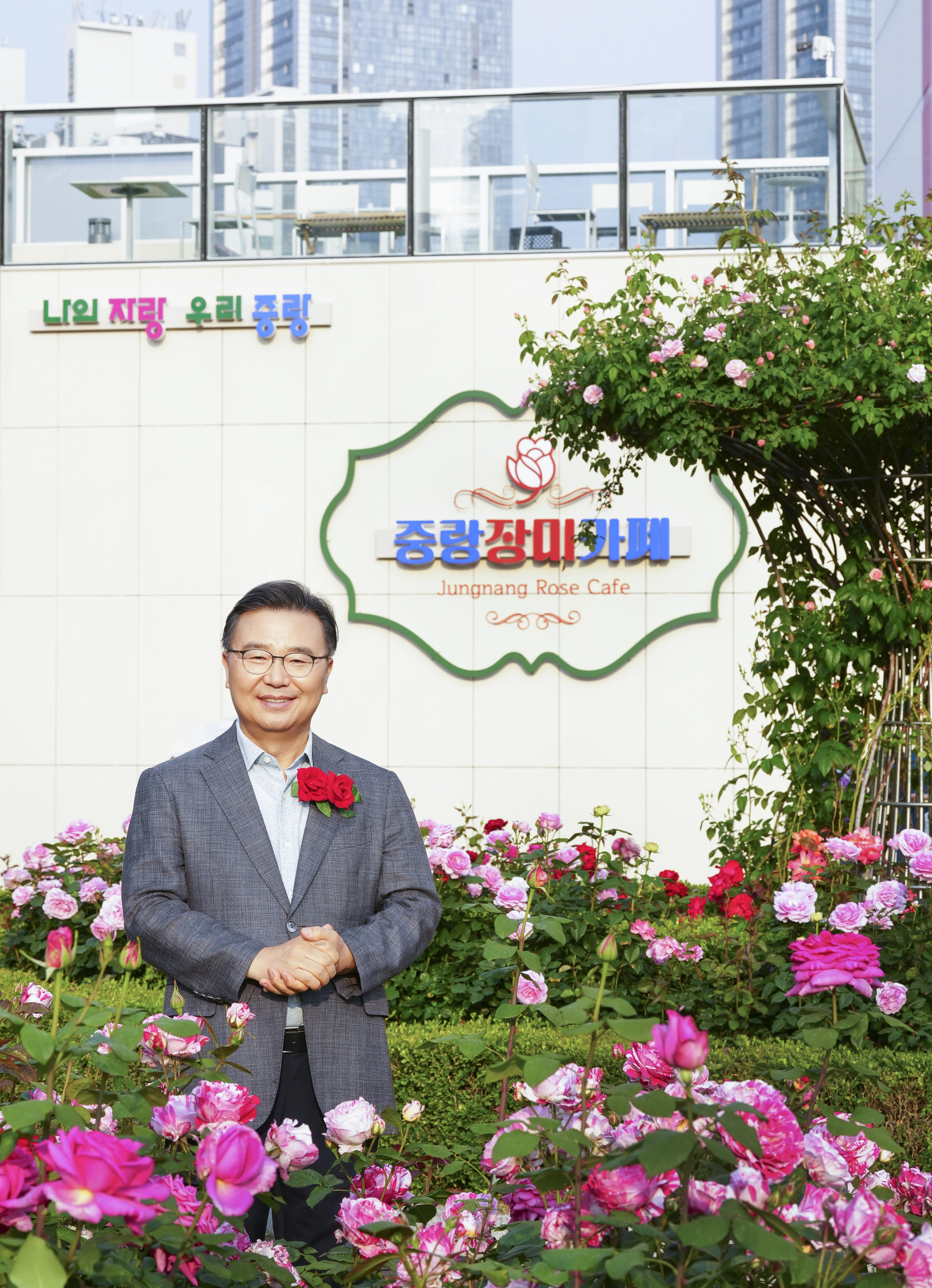 류경기 서울 중랑구청장이 중랑장미카페 앞에서 기념 촬영을 하고 있다.