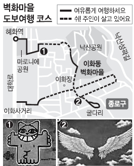 서울 종로구는 주민들과 관광객 편의를 위해 ‘이화동 벽화마을 착한여행 지도’를 15일부터 주요 관광안내소, 대학로 좋은 공연 안내센터, 이화동주민센터 등에 배포한다고 밝혔다. 5000부를 한국어와 영어로 제작했다. 2단 3접, 48×34㎝ 규격이다.